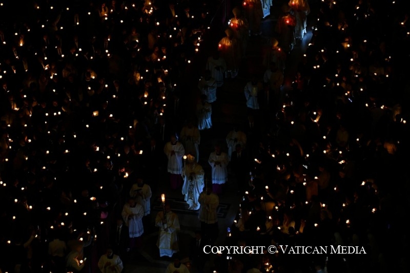 Así, queridos hermanos y hermanas, el diácono, al comienzo de esta celebración, ha alabado la luz de Cristo Resucitado, simbolizada en el Cirio pascual. De este único Cirio todos hemos encendido nuestras luces y, llevando cada uno una pequeña llama tomada del mismo fuego, hemos iluminado esta gran basílica. Es el signo de la luz pascual, que nos une en la Iglesia como lámparas para el mundo. Al anuncio del diácono hemos respondido “amén”, afirmando nuestro compromiso de abrazar esta misión, y dentro de poco repetiremos nuestro “sí” renovando las promesas bautismales.