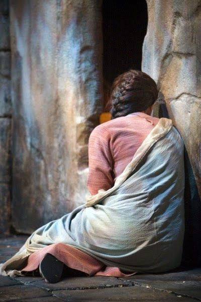 El día de la resurrección, María se había quedado llorando junto al sepulcro de Jesús. Sin dejar de llorar, se asomó al sepulcro y vio dos ángeles vestidos de blanco, sentados en el lugar donde había estado el cuerpo de Jesús, uno en la cabecera y el otro junto a los pies. Los ángeles le preguntaron: «¿Por qué estás llorando, mujer?» Ella les contestó: «Porque se han llevado a mi Señor y no sé dónde lo habrán puesto».