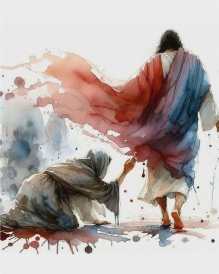 Jesús notó al instante que una fuerza curativa había salido de él, se volvió hacia la gente y les preguntó: «¿Quién ha tocado mi manto?» Sus discípulos le contestaron: «Estás viendo cómo te empuja la gente y todavía preguntas: ‘¿Quién me ha tocado?’ » Pero él seguía mirando alrededor, para descubrir quién había sido. Entonces se acercó la mujer, asustada y temblorosa, al comprender lo que había pasado; se postró a sus pies y le confesó la verdad. Jesús la tranquilizó, diciendo: «Hija, tu fe te ha curado. Vete en paz y queda sana de tu enfermedad».
